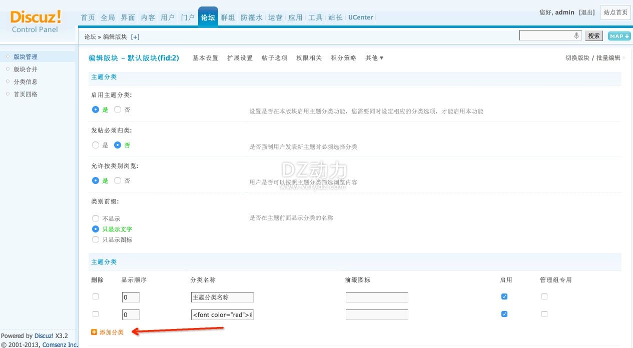 1.進論壇后臺,點需要設置的版塊后面的“編輯”,其他》主題分類,啟用主題分類:是,點擊“添加分類”,輸入分類名稱點提交。