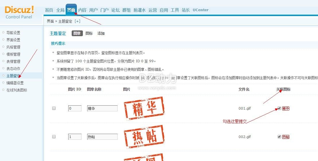 (關聯圖標的用途是將帖子內顯示的主題圖章和版塊列表頁顯示的圖標相關聯,例如將“熱帖”小圖標打鉤,則在帖子被蓋章為“熱帖”時,列表頁也會增加一個“熱帖”圖標)