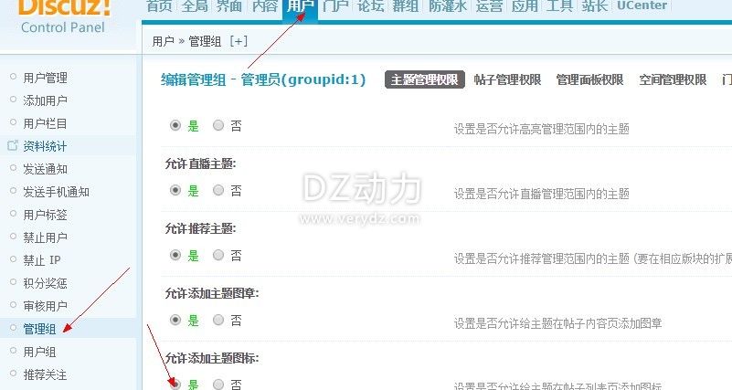 第一步、我們需要在這里開放權限:用戶 >> 管理組 >> 管理員-管理權限 >> 允許添加主題圖標:是