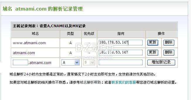 第二條:最前面文本框處留空,什么都不填寫,最后面文本框輸入IP地址,點“增加新記錄”按鈕,類型同樣選擇默認的A;