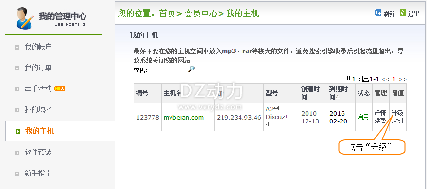 ,輸入用戶名和密碼,登錄;--->進入“會員中心”---“我的主機”---“升級”
