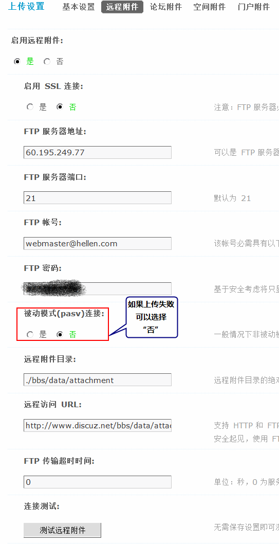 4)遠程訪問 URL:支持 HTTP 和 FTP 協議,結尾不要加斜杠“/”;如果使用 FTP 協議,FTP 服務器必需支持 PASV 模式,為了安全起見,URL瀏覽附件FTP連接的帳號不要設置可寫權限和列表權限。