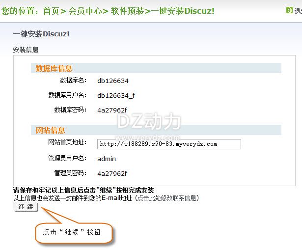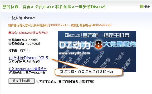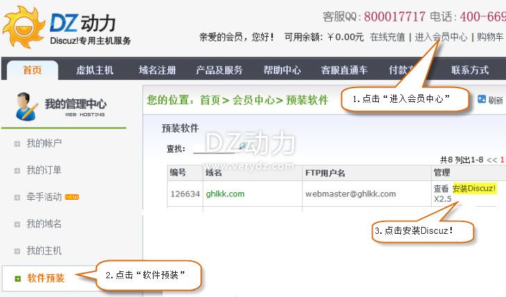 ,點擊“進(jìn)入會員中心 》 軟件預(yù)裝 》 安裝Discuz!”;