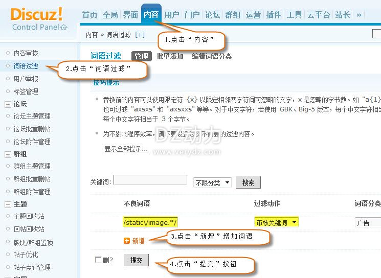 ,點擊“內容 》 詞語過濾”添加如下內容即可: